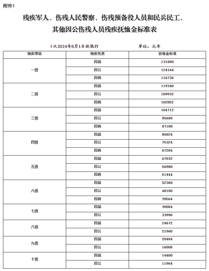 1.残疾军人、伤残人民警察、伤残预备役人员和民兵民工、其他因公伤残人员残疾抚恤金标准表